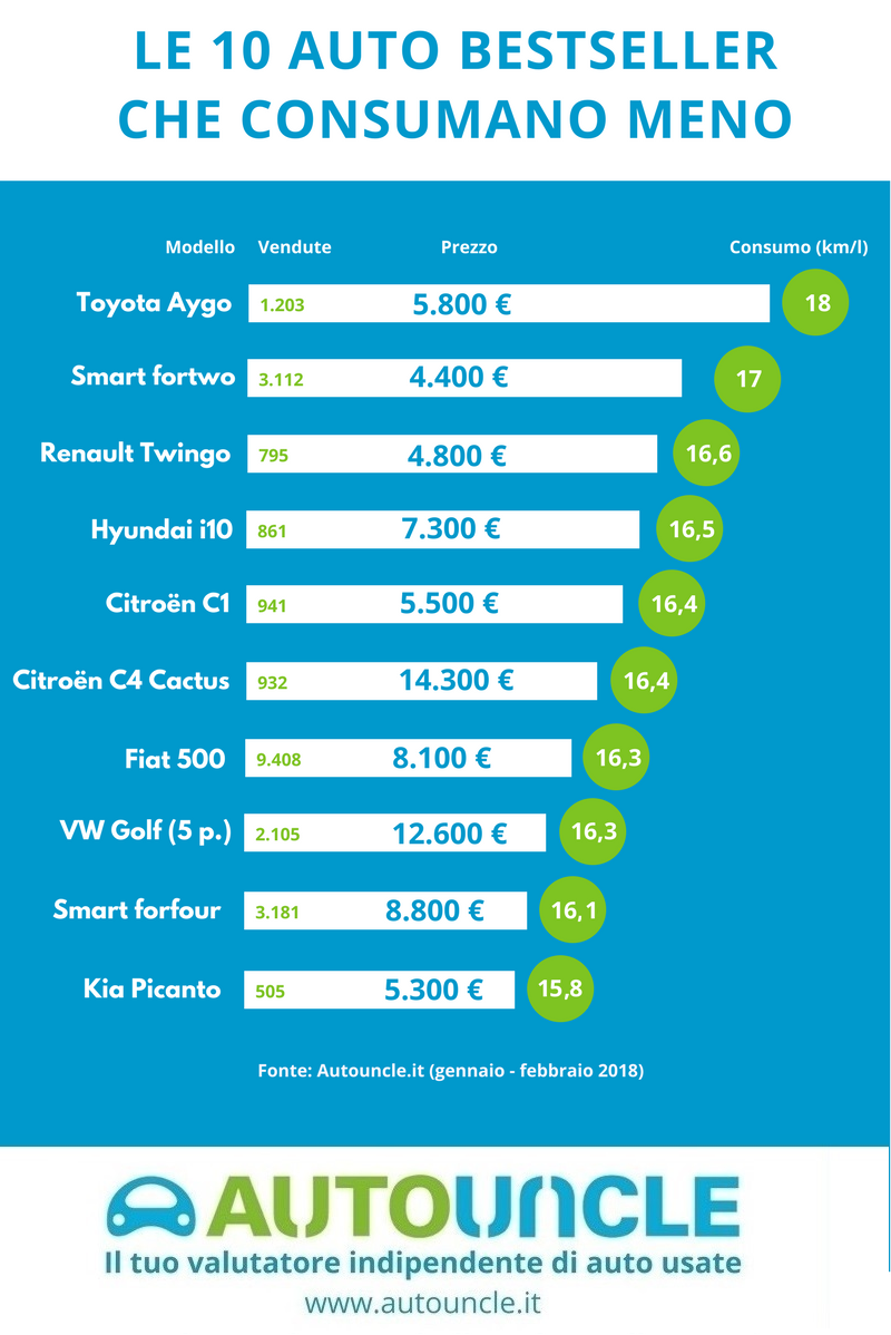 il primo posto del podio è occupato dalla Toyota Aygo capace di percorrere 18km con 1 litro di carburante. Seguita dalla Smart fortwo coupè che ci fa percorrere 17km per 1 litro. La francese Renault Twingo chiude con i suoi 16,6 km per litro.